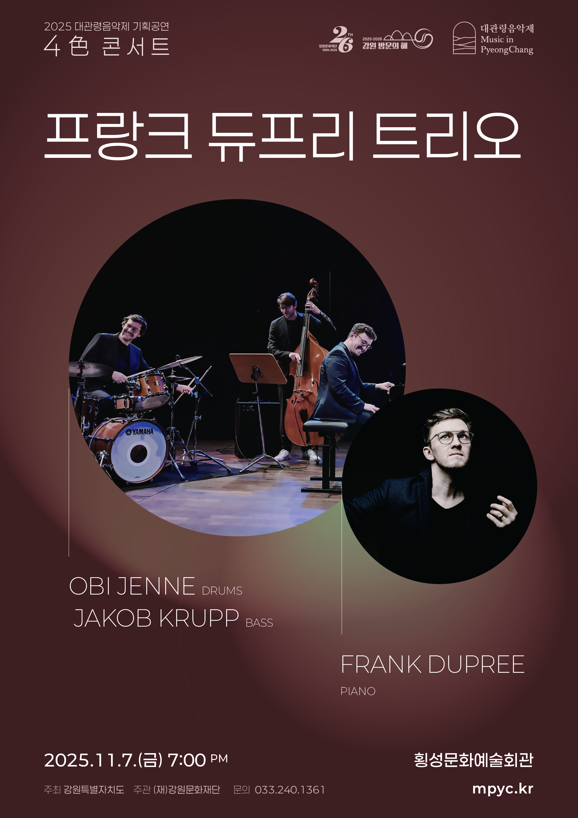 넘치는 열정, 탁월한 음악적 존재감, 클래식과 재즈의 경계를 자유롭게 넘나들며 폭넓은 음악 세계를 아우르는 프랑크 듀프리 트리오 Frank Dupree Trio는 피아니스트이자 지휘자인 프랑크 듀프리(Frank Dupree)를 중심으로, 드러머 오비 옌네(Obi Jenne)와 콘트라베이스 연주자 제이콥 크룹(Jakob Krupp)이 결성된 피아노 앙상블 팀입니다.
